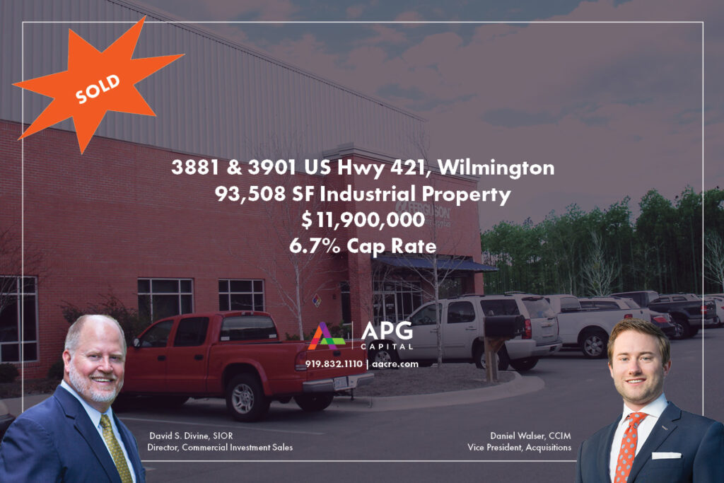 APG Capital has closed on the sale of a 93,508 square foot industrial building at 3881 US Hwy 421 North in Wilmington. The single-tenant building has been home to Ferguson Enterprises since 2009, who recently signed a lease extension until 2033.